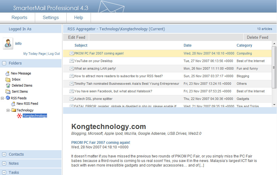Anyway, today I was a little itchy and tried poking around the webmail system that comes with my web hosting account. We are using SmarterMail Professional. All the features are pretty basic… but what interests me is the RSS Feed reader function.