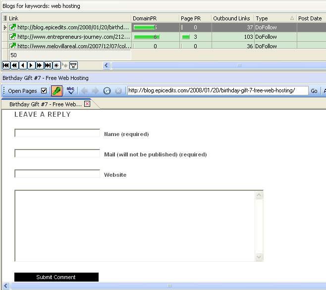 What you need to do is very simple. Click on the blog’s name, read the post, write a comment, and click on the Submit button. It could take you hours to find the relevant blogs to read and comment on, but now with this dofollow blogs finder software, it will take you just a couple of minutes!