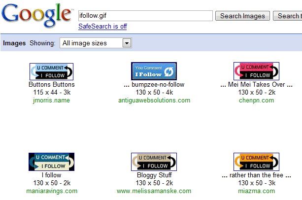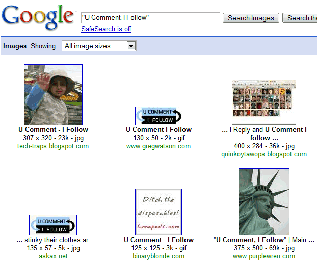 Now, give it a try. In Google Image Search, search for “U Comment I Follow”, you will see a substantial list of dofollow blogs. You can of course try some variations, such as omit the double quotes to return more results but probably less accurate. You can also append your keyword (such as “malaysia blogger”) to get more targeted results in your niche.