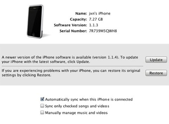 Once you have that all settled, plug in your iPhone and connect it to iTunes. The iPhone page should appear and inform you that a newer version of the firmware is available. Click on ‘Update’.